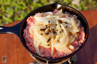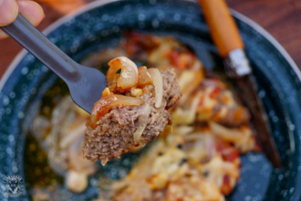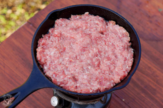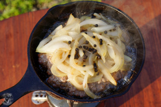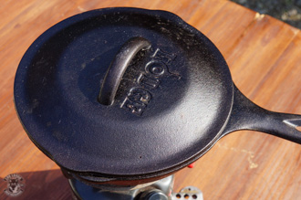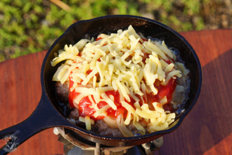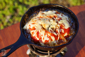 今回は6.5インチのカバー付きスキレットを使いましたが、蓋があってある程度の厚みがあるフライパンでも作る事が出来ます。ただ、可能ならカバー付きのキャストアイアンスキレットの方が、熱が均等に伝わってオーブンのように調理出来るのでお勧めです。なお、キャンプ用のクッカーセットのフライパンの場合、薄手の素材の場合は焦げ付きやすいので向いてないと思います。