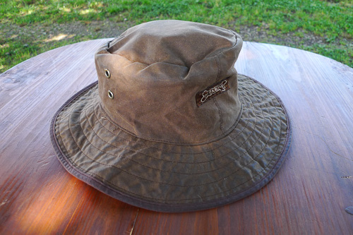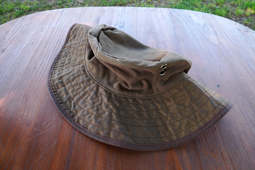 本当はもっとつばが広いほうが雨が襟首にかからなくっていいんですが。