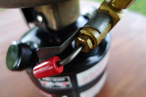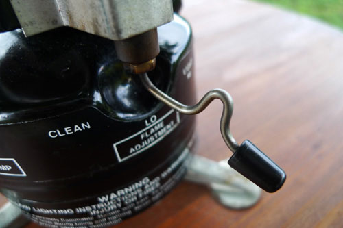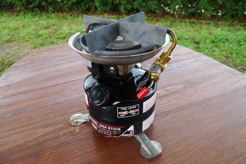 やっぱりストーブはガソリンですよ。KUROの愛用するストーブは、無鉛ガソリンのつかえるタイプなど同型の物を4台持っていますが、これを一番愛用しています。2レバーはこれより550Bの方が弱火にすることができますが、形はこれが好きですねえ、やっぱり。