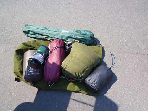 この時に中に入っていたる物はこんな感じ。冬用シュラフ、テント、マット、ダウンジャケット、折りたたみ椅子などです。