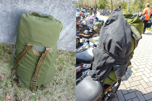 バイカーには一番ポピュラーなダッフルバッグです。私ももう40年以上愛用しています。丈夫とはいえ、これで買ったのは3枚目です。