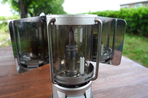 リフレクターを開くとこの用になって明るさが一気に増します。このランプ、マントルが無い時はろうそくのようにトーチモードで使う事が出来るのもありがたいですね。まあ、その場合はかなり暗いですが。
