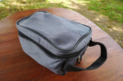 通常はこのバッグ(百均で購入)に、調理器具で紹介している小型のガスストーブと一緒に入れて持って歩いています。