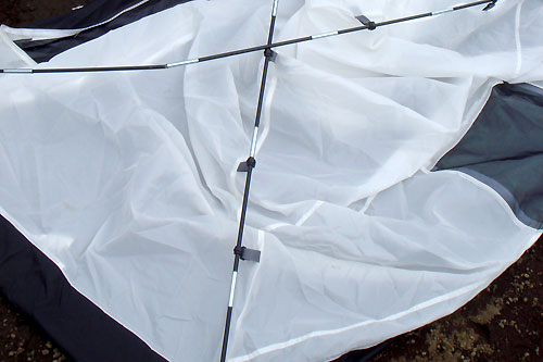 骨組みの組みやすさはメーカーによって、随分と異なるものです。このテントは安物ですが、ポールにフックで下げる構造なんで、1人でも楽に組めるのが良いです。